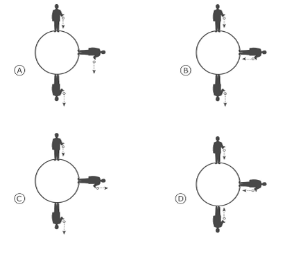 3 האנשים העומדים על פני כדור הארץ ב-3 מקומות שונים ואוחזים בכדור. אם הם ישמטו את הכדור הוא ייפול בגלל הכבידה. איזה מן האיורים הבאים מתאר את כיוון הנפילה של הכדורים בצורה הכי מדויקת?