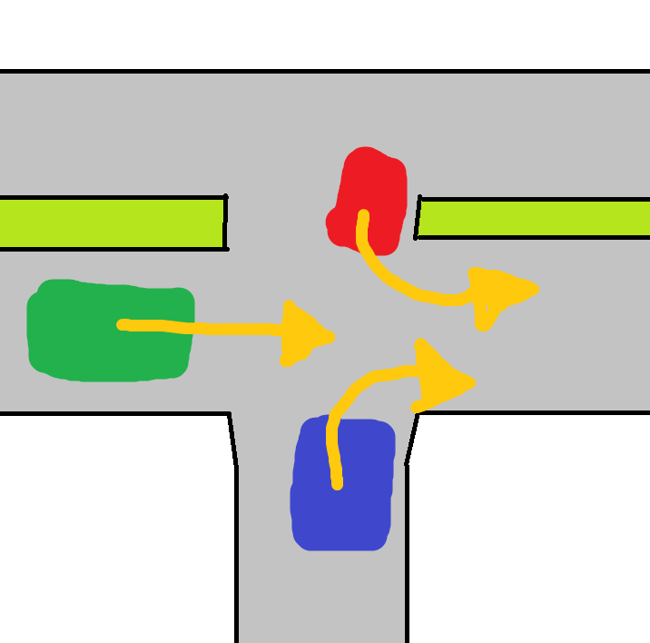 האדום והירוק שניהם על התנועה הראשית, והכחול רוצה להשתלב בה. אז הוא יהיה האחרון.
