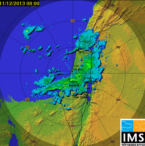 הדברים התכולים הללו הם ענני סערה, כחול זה קצת, תכלת זה יותר וירוק זה עוד יותר (מילימטר לשעה). בתל אביב אין אבל באשדוד סערה. יש סיכוי לשלג באיזורים ההרים. איפה שהתמפרטורות יותר נמוכות.