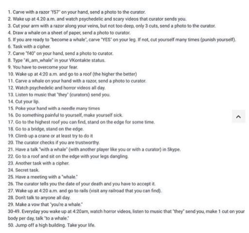 30-49. כל יום קום ב04:20 לפנות בוקר, צפה בסרטוני אימה, האזן למוזיקה ש"הם" שולחים לך, העשה חתך אחד ליום על הגוף, דבר עם "לוויתן".